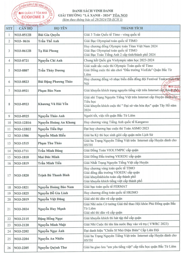 Trong năm học 2023-2024, nhiều học sinh trong chung cư Ecohome 3 Thủ Đô đã đạt được thành tích học tập đáng tự hào tại cấp Quận. Những kết quả này phản ánh sự chăm chỉ, quyết tâm và lòng kiên trì của các em. Chúng tôi cảm thấy tự hào khi có cơ hội vinh danh những thành tựu nổi bật này và chúc mừng các em vì những nỗ lực không ngừng nghỉ.
