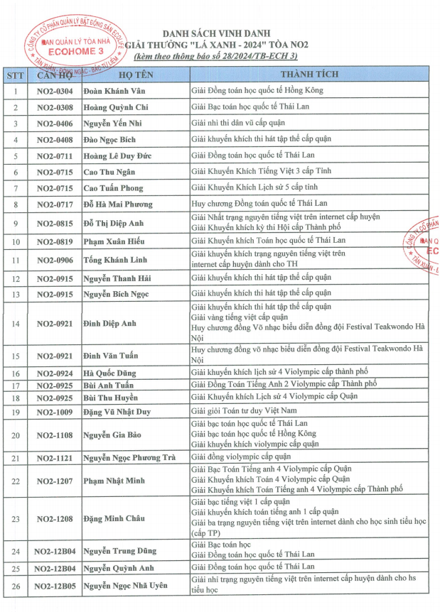 DANH SÁCH VINH DANH HỌC SINH ĐẠT GIẢI THƯỞNG LÁ XANH ECOHOME 3