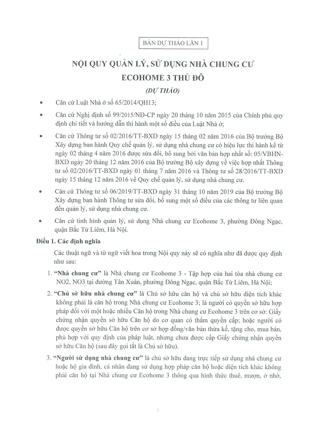 1. Tài liệu: Dự thảo Nội quy quản lý, sử dụng nhà chung cư Ecohome 3 Thủ Đô được đăng công khai tại trang thông tin điện tử của chung cư Ecohome 3 tại địa chỉ: https://www.ecohome3thudo.com; Gửi Thư điện tử cho toàn thể cư dân; Bản giấy được niêm yết tại bảng thông tin Tòa No2; Tòa No3 Ecohome 3 và 01 bản cứng gửi tới các Ông/ bà Trưởng/ phó Tầng.