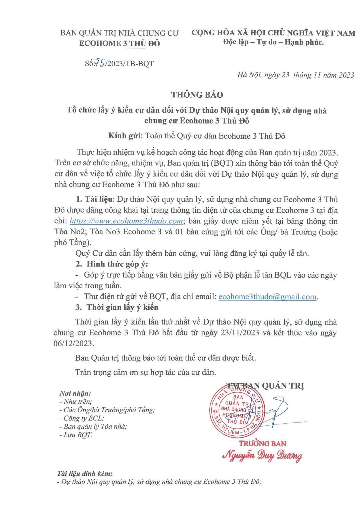 Thời gian lấy ý kiến cư dân về Dự thảo Nội quy quản lý, sử dụng nhà chung cư Ecohome 3 Thủ Đô bắt đầu từ ngày 23/11/2023 và kết thúc vào ngày 06/12/2023.