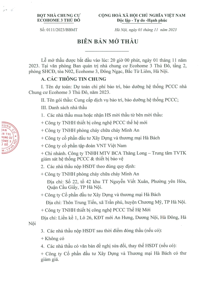 Ban quản trị Nhà Ecohome 3 Thủ đô đã tổ chức lễ mở thầu lần thứ 2 của gói thầu: “Cung cấp dịch vụ bảo trì, bảo dưỡng hệ thống PCCC”. Lễ mở thầu được tổ chức vào ngày 01/11/2023 tại văn phòng Ban Quản trị - tầng 2, Tòa No2, Phường Đông Ngạc, Quận Bắc Từ Liêm, Hà Nội. Tham dự lễ buổi lễ gồm: Các thành viên Ban quản trị; Đại diện Ban quản lý chung cư; Đại diện Tổ tư vấn và Tổ thẩm định thầu; Đại diện các công ty tham dự; Đại diện cư dân chung cư Ecohome 3;
