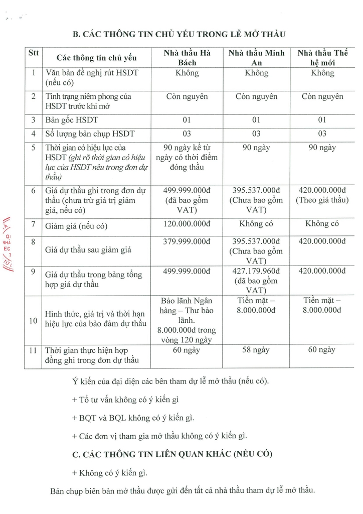 Vào lúc 20 giờ 15 phút, mỗi bộ hồ sơ của từng đơn vị đã lần lượt được tháo niêm phong, thống kê tài liệu văn bản có trong hồ sơ theo đúng trình tự, thủ tục. Đại diện các bên tham dự lễ mở thầu đã cùng xác nhận và ký biên bản mở thầu.