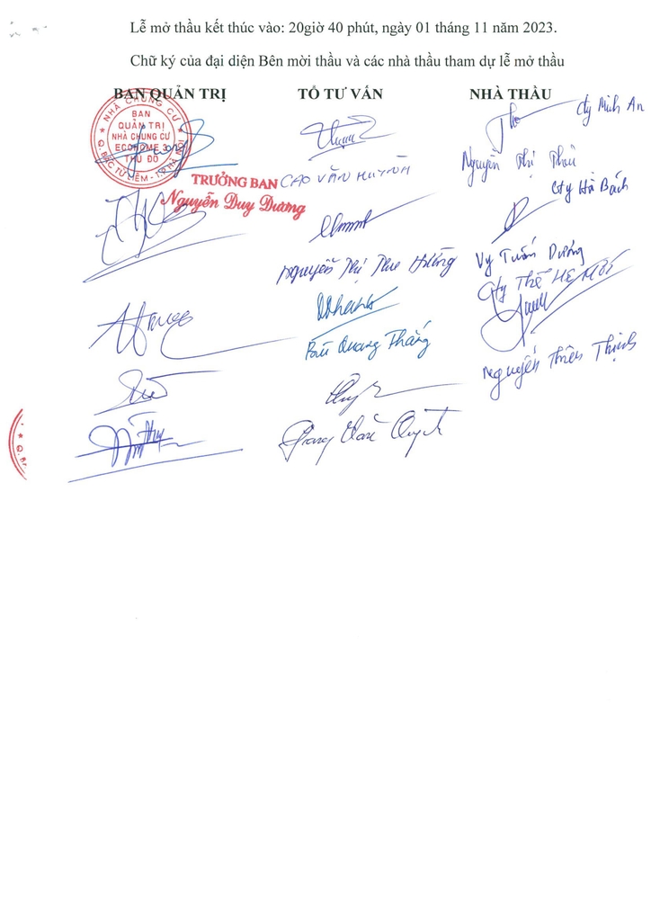 Biên bản mở thầu đã được lập và được các bên xác nhận ký ngay sau khi mở thầu. Buổi lễ đã kết thúc vào đúng 21h50p ngày 01/11/2023.