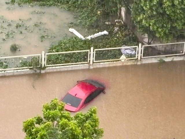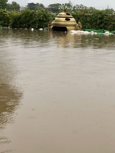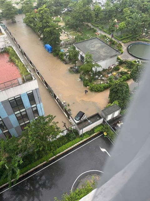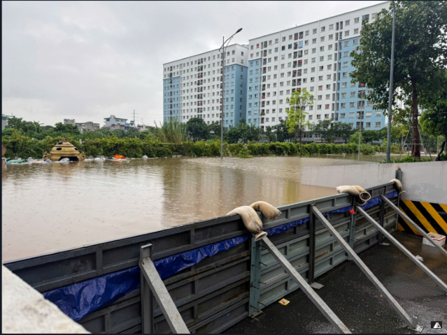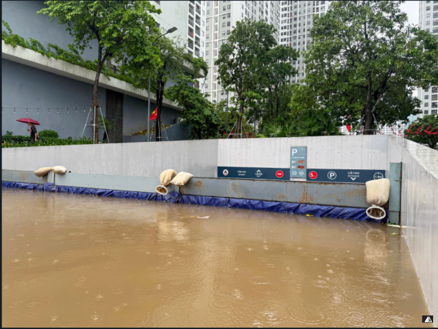 Lối xuống tầng hầm gửi xe bị chặn bằng tôn, bao cát và bạt chống ngập, mực nước bên ngoài dâng cao hơn 1 mét, đe dọa hàng trăm phương tiện của cư dân. Bên trong nội khu, nhiều tuyến đường biến thành “sông”, xe máy, ô tô ngập sâu, rác thải trôi nổi.