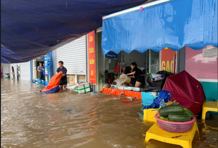 Hình ảnh ghi nhận cho thấy mực nước trước cửa hầm đỗ xe cao tới hơn 1 mét, toàn bộ khu vực lối vào bị phong tỏa, gây gián đoạn nghiêm trọng hoạt động của cư dân. Khu vực thương mại tầng một chịu thiệt hại nặng, nước tràn vào cửa hàng, người dân phải dùng bao tải, chăn màn che chắn, tát nước cứu hàng hóa. Nhiều gian hàng tạp hóa, quần áo, thực phẩm ướt sũng, hư hỏng.