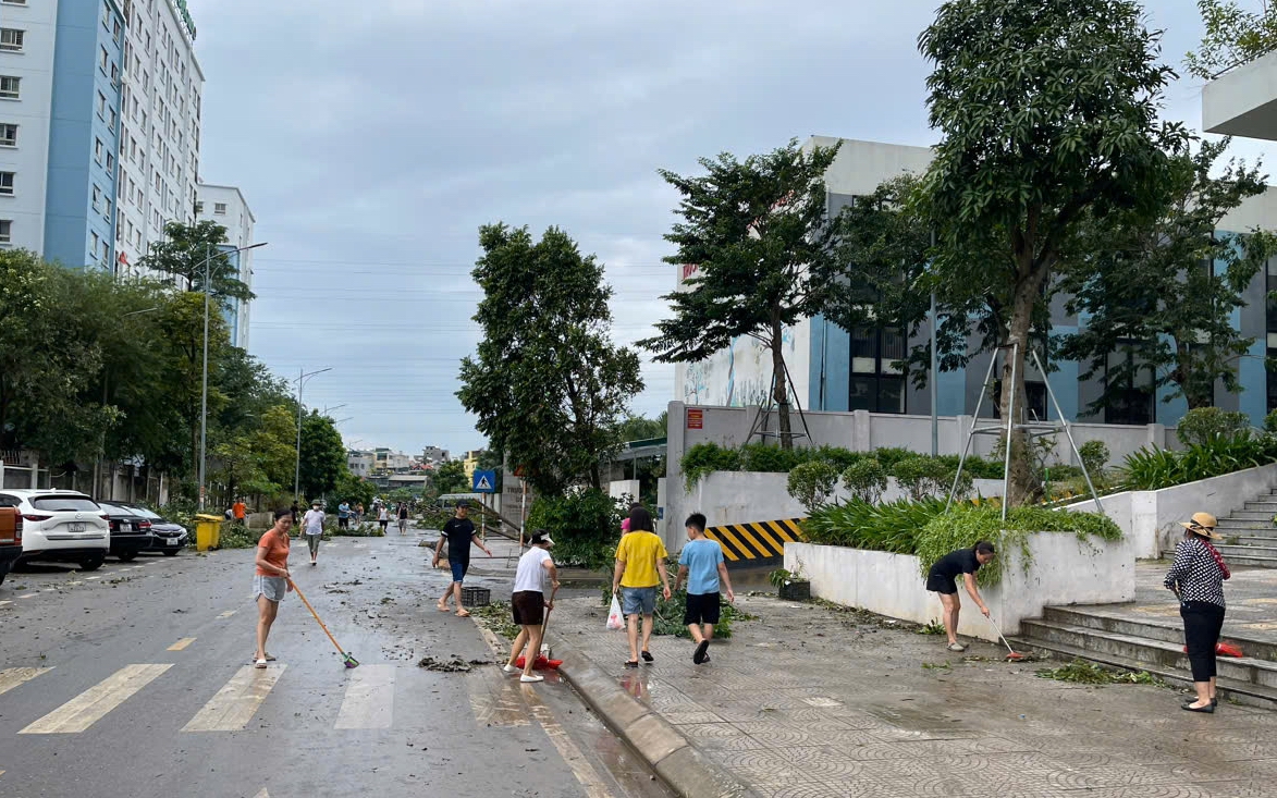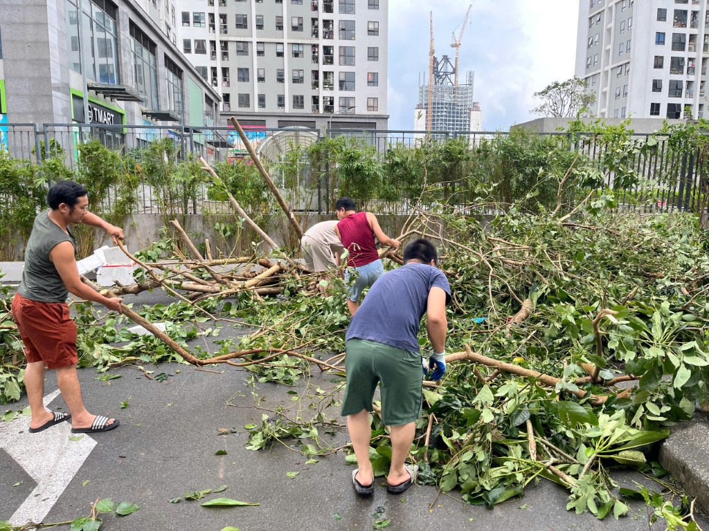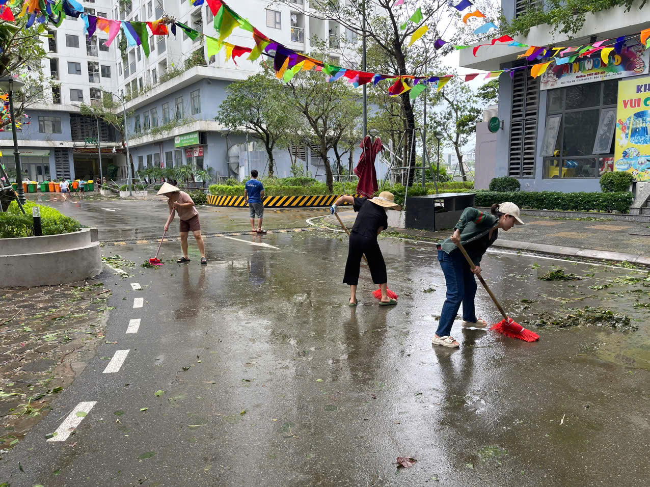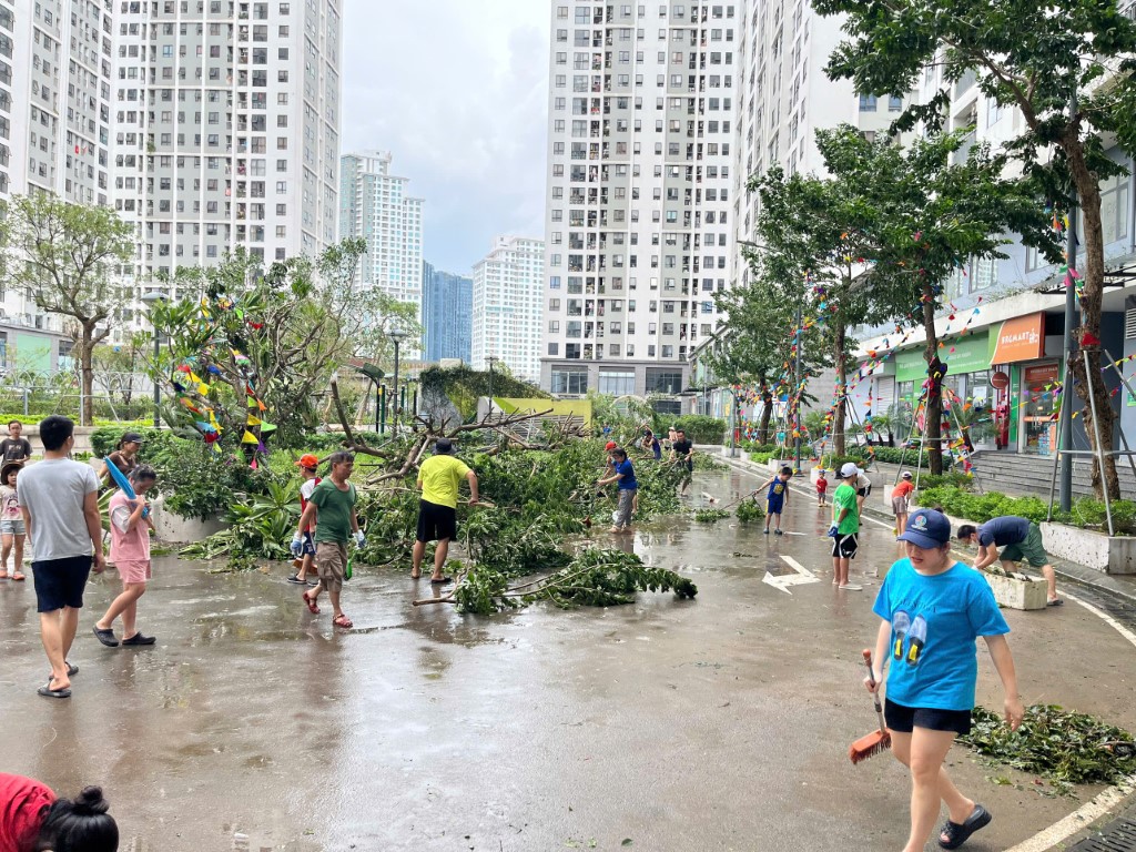 Tại khu vực chung cư Ecohome 3 Thủ Đô, công tác khắc phục hậu quả đã được triển khai ngay khi bão ngớt mưa gió. Cư dân và lực lượng BQL đã tích cực tham gia vào việc dọn dẹp cây đổ và các vật cản do bão gây ra. Từ sáng sớm, người dân đã cùng nhau dọn dẹp các khu vực bị ảnh hưởng nặng nề, bao gồm các khu vực hành lang, sân chơi và khu vực xung quanh tòa nhà.