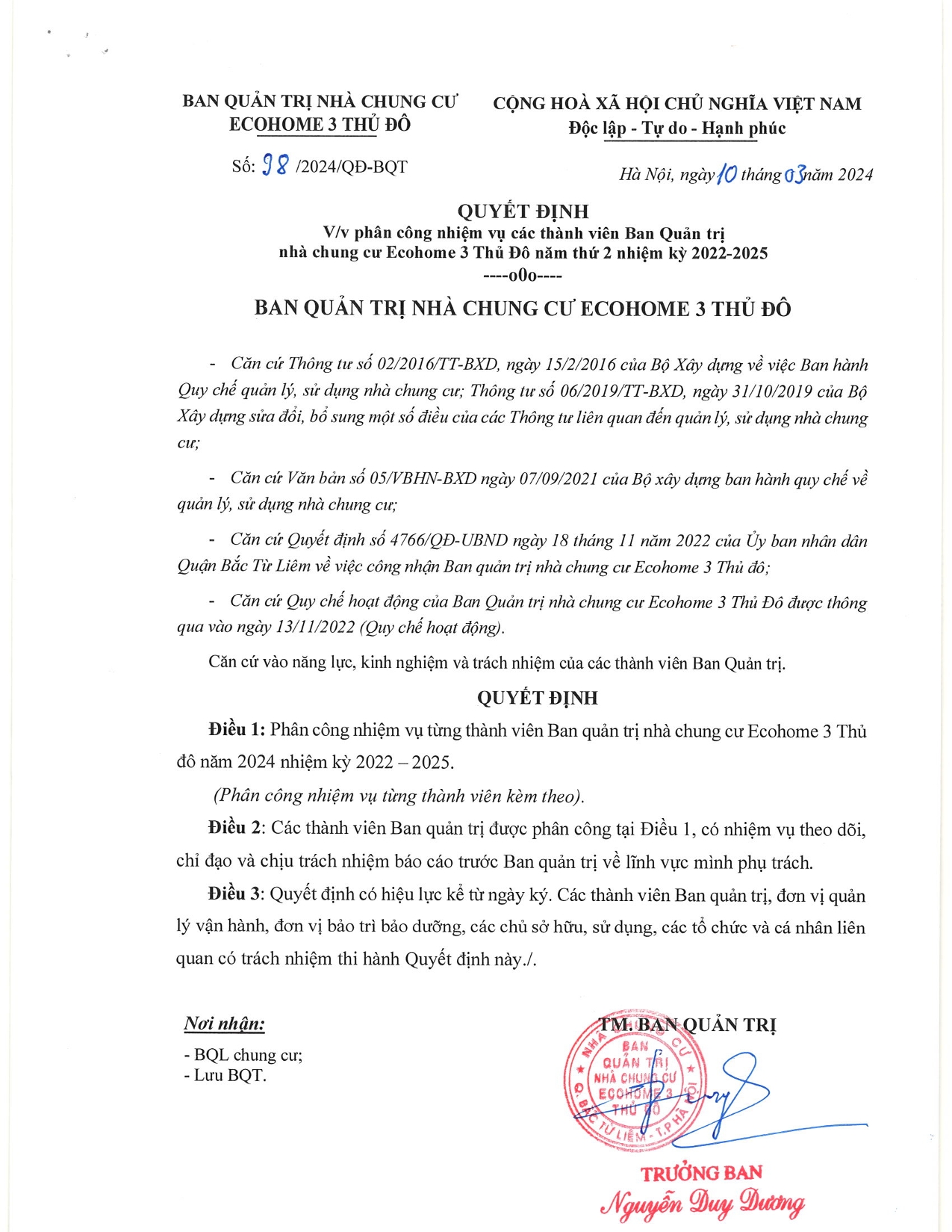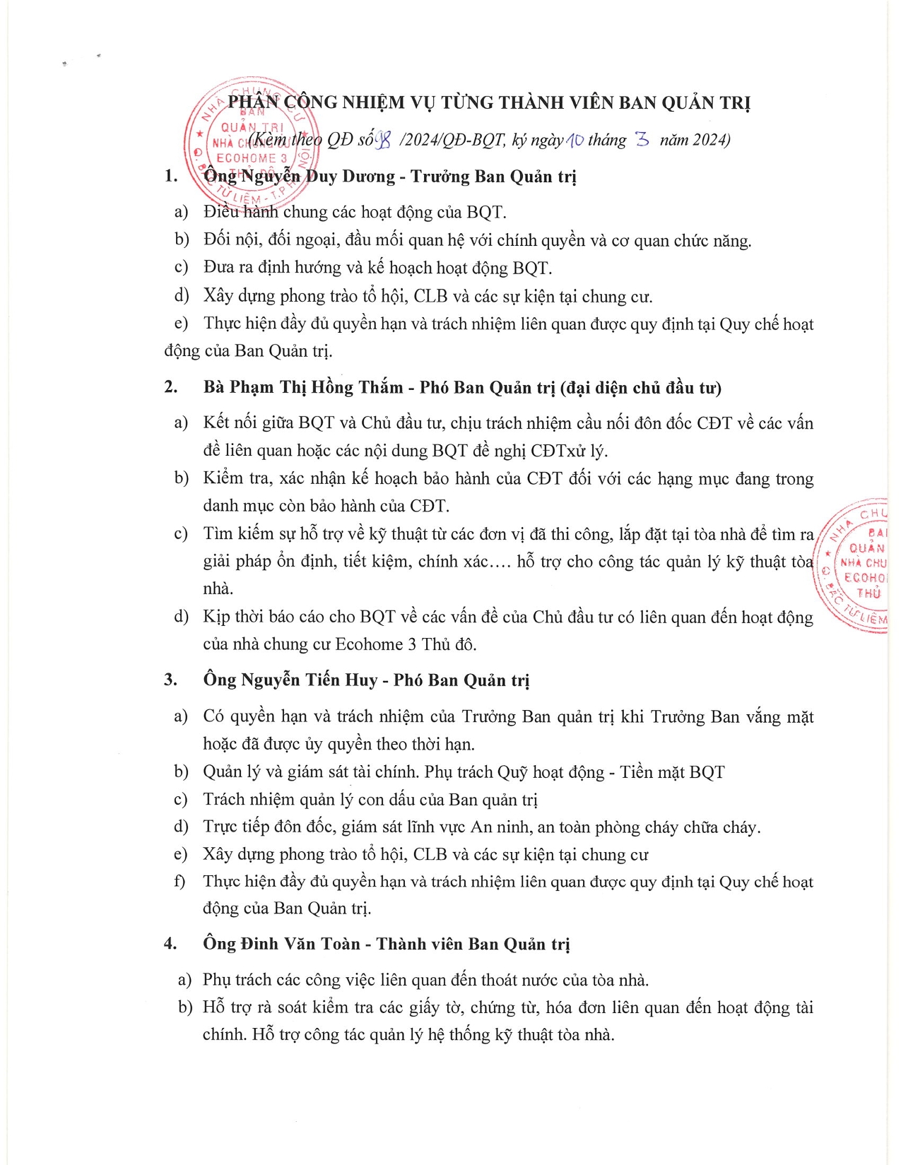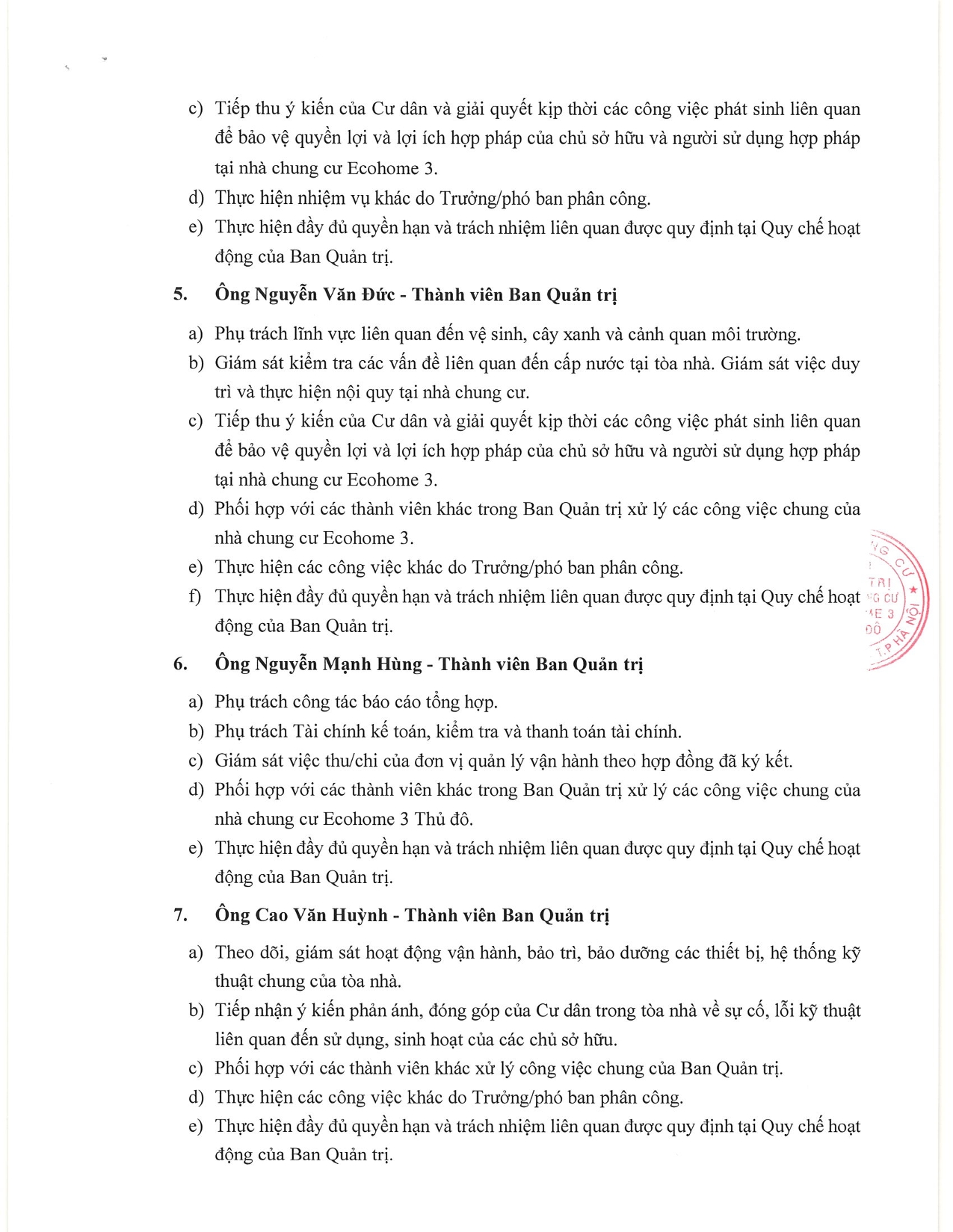 Phân công nhiệm vụ các thành viên Ban Quản trị nhà chung cư Ecohome 3 Thủ Đô năm thứ 2 nhiệm kỳ 2022-2025