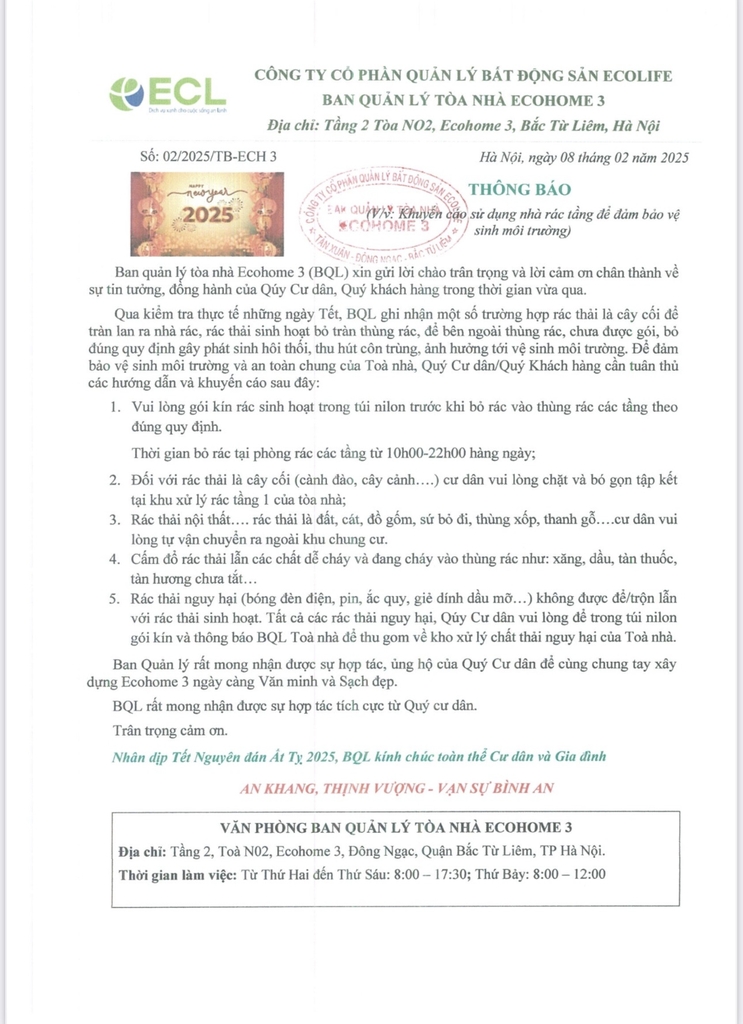 BQL kính gửi Quý cư dân, Quý khách hàng thông báo số 02/2025/TB-ECH 3 về khuyến cáo sử dụng nhà rác tầng để đảm bảo vệ sinh môi trường.