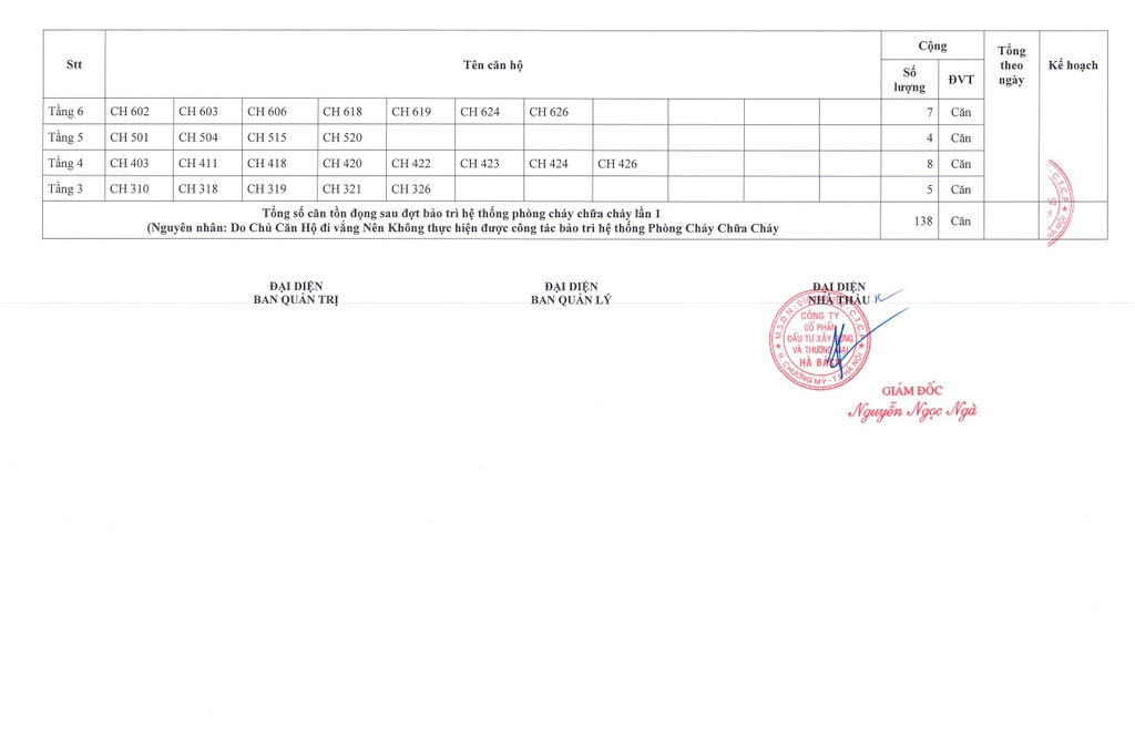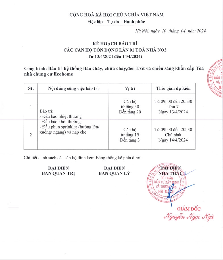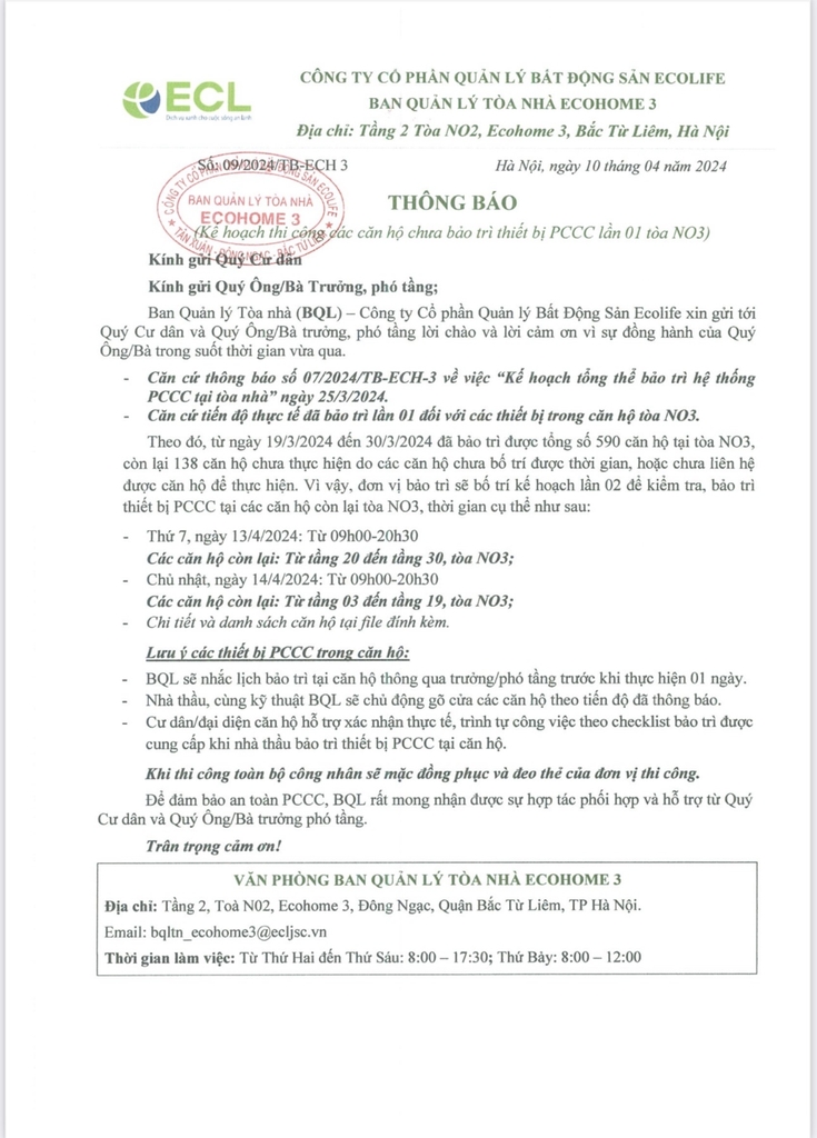 TB số 09/2024/TB-ECH 3 về việc Kế hoạch thi công các căn hộ chưa bảo trì thiết bị PCCC lần 01 tòa NO3