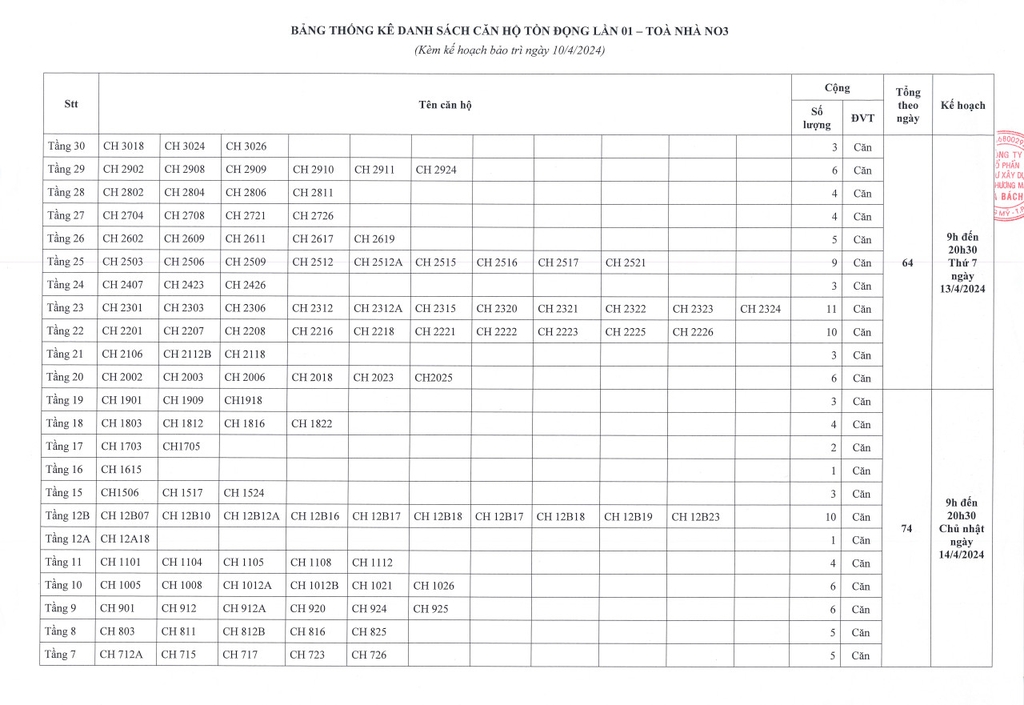 BQL kính gửi TB số 09/2024/TB-ECH 3 về việc Kế hoạch thi công các căn hộ chưa bảo trì thiết bị PCCC lần 01 tòa NO3, thời gian cụ thể như sau: