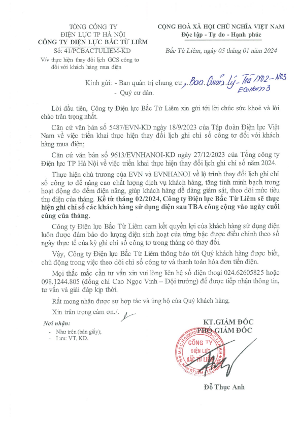 Ban quản lý kính gửi Quý cư dân công văn số 41/PCBACTULIEM-KD của công ty điện lực Bắc Từ Liêm về việc thực hiện thay đổi lịch ghi chỉ số công tơ đối với khách hàng mua điện.