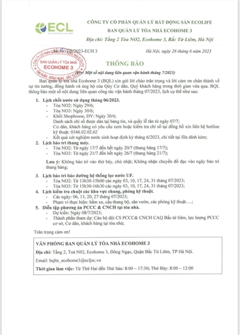 Thông báo số 10/TB/2023-ECH 3 về một số nội dung liên quan đến công tác vận hành tháng 7/2023;