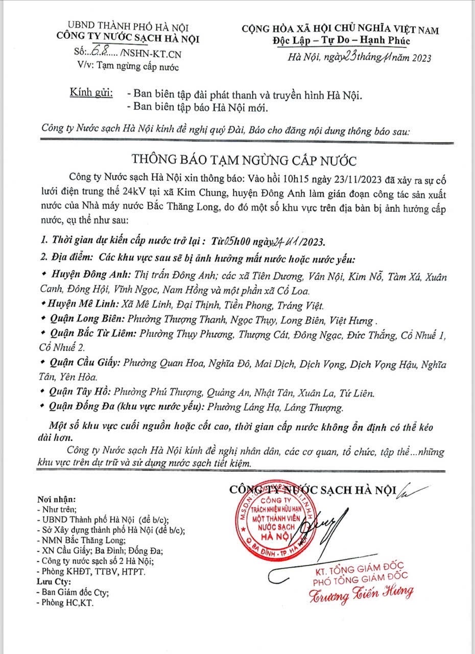 THÔNG BÁO TẠM NGỪNG CUNG CẤP NƯỚC TỪ CÔNG TY NƯỚC SẠCH CẦU GIẤY