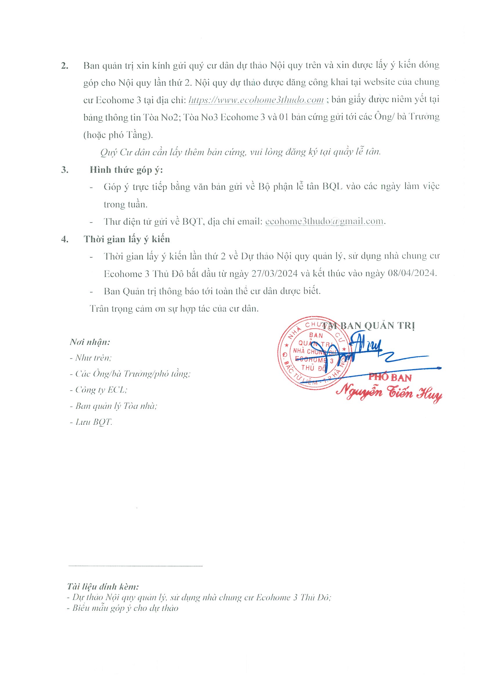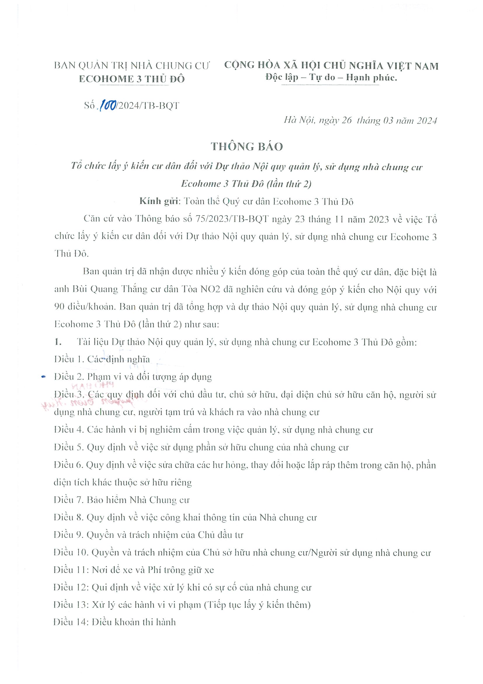 THÔNG BÁO Tổ chức lấy ý kiến cư dân đối với Dự thảo Nội quy quản lý, sử dụng nhà chung cư Ecohome 3 Thủ Đô (lần thứ 2)