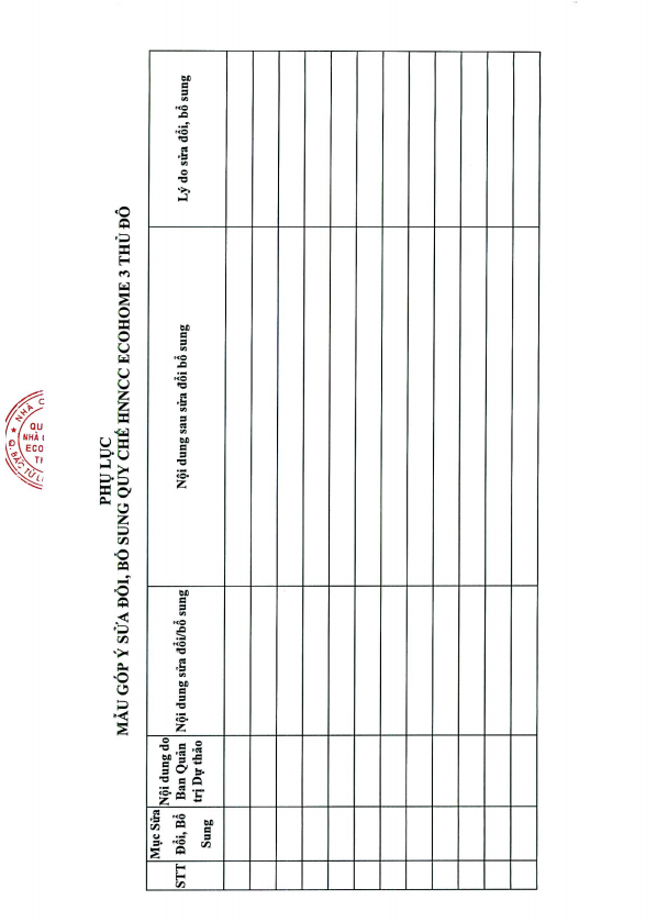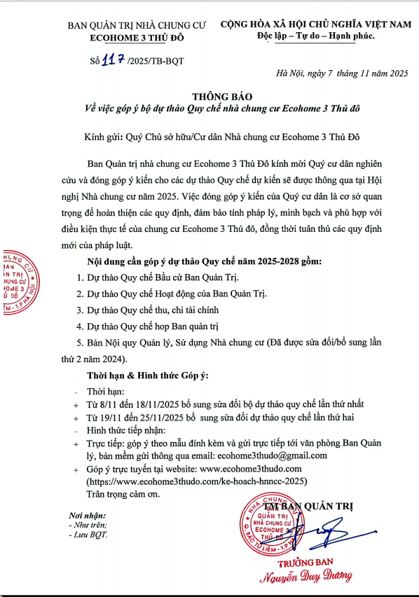 Thông báo về việc góp ý bộ dự thảo Quy chế nhà chung cư Ecohome 3 Thủ Đô