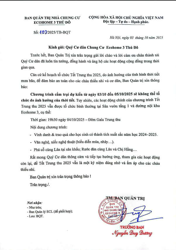 Căn cứ kế hoạch tổ chức Tết Trung thu 2025, do ảnh hưởng của thời tiết mưa bão, để đảm bảo an toàn cho các cháu thiếu nhi và cư dân, Ban Quản trị xin thông báo như sau: