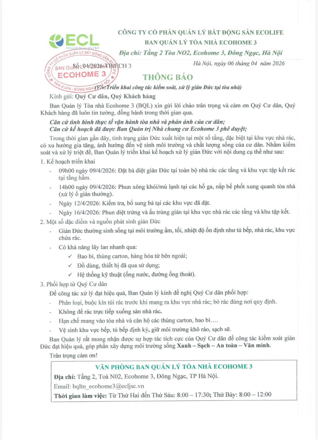 Ban Quản lý Tòa nhà Ecohome 3 trân trọng gửi tới Quý Cư dân thông tin về kế hoạch triển khai kiểm soát và xử lý gián Đức tại tòa nhà.
