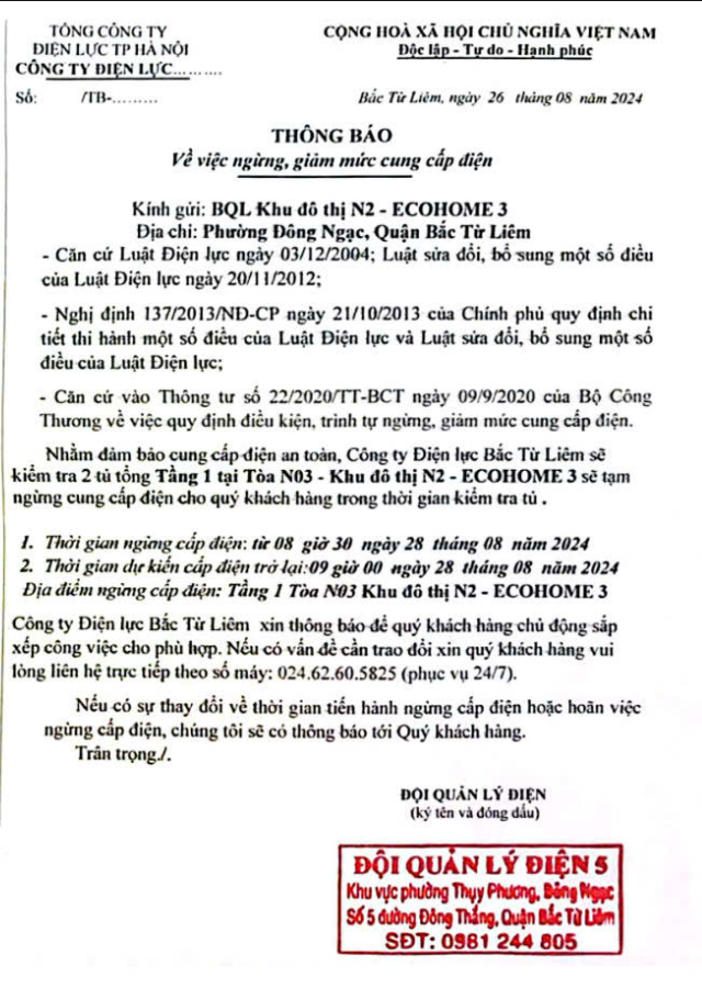 3. Địa điểm ngừng cấp điện: Tầng 1, Tòa N03, Khu đô thị N2 - ECOHOME 3